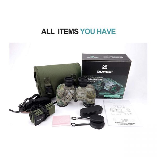 QUNSE 10×50 Military HD Binoculars with Compass and Rangefinder Large Object FMC Lens Clear View BAK4, with Shoulder Harness Strap and Binoculars Bag (Camouflage)