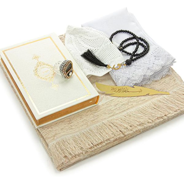 Prayer Gift Box for Hajj and Umrah, Muslim Prayer Rug, Islamic Mat, 99 & 33 Pearly Beads Tesbih, Yaseen Book, Miswak, Hijab