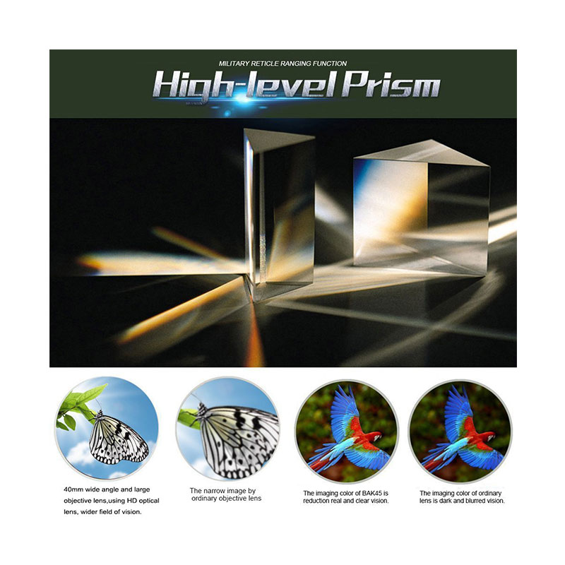 2. Using optical glass lens and blue film, and the diameter and distance of exit pupil is 5.mm and 15.5mm,the field of vision is 145M/1000M, it will become clear and high definition image;