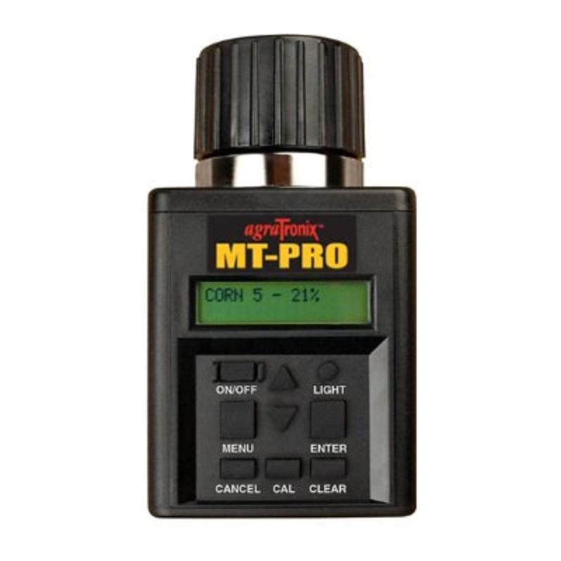MT-PRO Portable Grain Moisture Tester Part No. 08125 Features Direct readout for 40 different grain scales Backlit display for nighttime use Built-in calibration button for displaying the average of saved test results Multi-language display – English, Spanish, French, German, Italian, Portuguese and Swedish Higher-frequency, capacitive circuit improves accuracy Specifications Moisture range: 5% to 40% depending on grain tested Temperature range: 32° to 113°F (0° to 45°C) Repeatability & Accuracy: ± 0.5% in normal moisture range for stored grain Display Resolution: 0.1% moisture Accessories Replacement Cap – Part No. 06061 Carrying Case – Part No. 06053 Grains: Barley, Beet, Buckwheat, Canary, Clover: Purple, Clover: White, Corn: High Moisture, Corn: Low Moisture, Dactyl, Fescue, Flax (Linseed), Lentils, Lupins: Yellow Millet, Mustard, Navy Beans, Oats, Peanuts: Spanish, Peas: Fodder, Peas: Green, Peas: Yellow, Phleum, Popcorn: White, Popcorn: Yellow, Rapeseed (Canola) Rice: Long, Rice: Medium, Rye, Rye Grass, Safflower, Sorghum (Milo), Soybeans, Sunflower, Sunflower: Stripe, Triticale, Wheat: Durum, Wheat: Hard Red Spring, Wheat: Hard Red Winter, Wheat: Soft Red Winter, Wheat: White