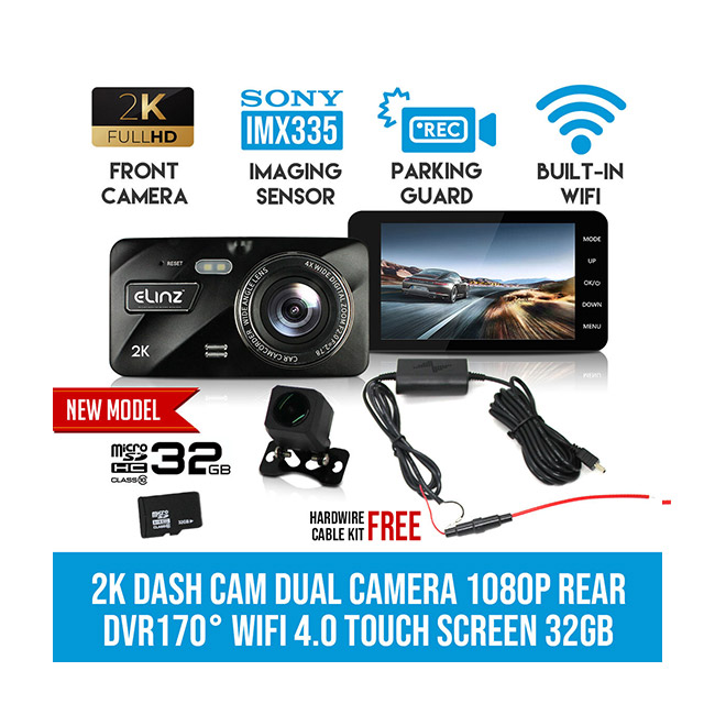 Elinz 2K Dash Cam Dual Camera Reversing 1080P Rear Car DVR Recorder Video 170° WiFi 4.0 Touch Screen 32GB