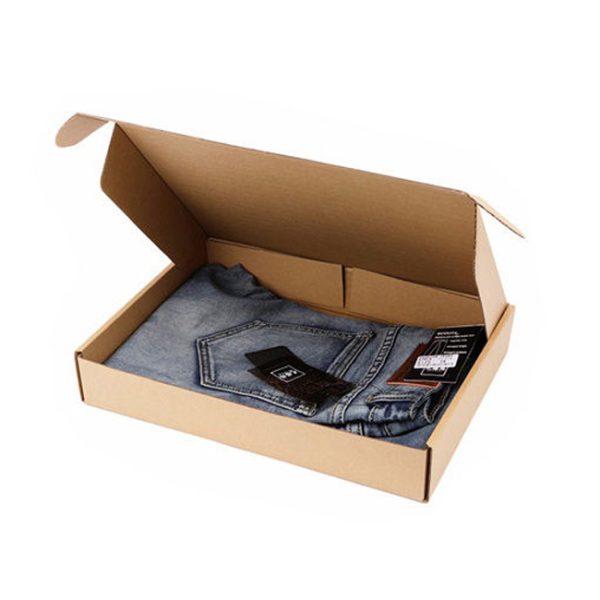 Customized clothing packaging box made from recyclable materials, featuring a hand-length handle and bio-degradable properties.