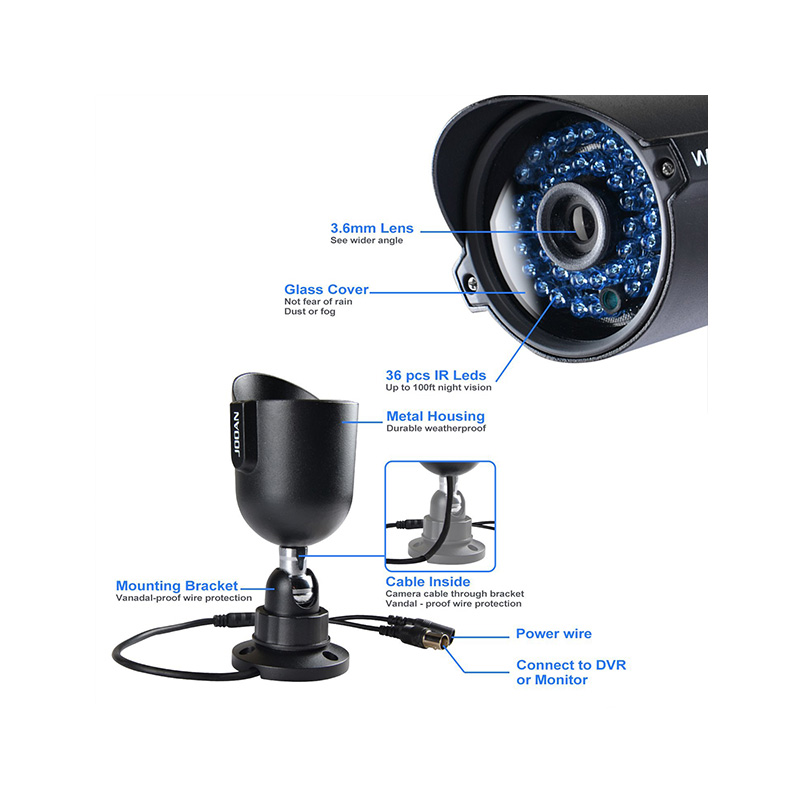 3.6mm varifocal lens for a wide range of viewing area; 36 IR LEDs for Night Vision Up to 15 meters distance for 24-hour Surveillance.