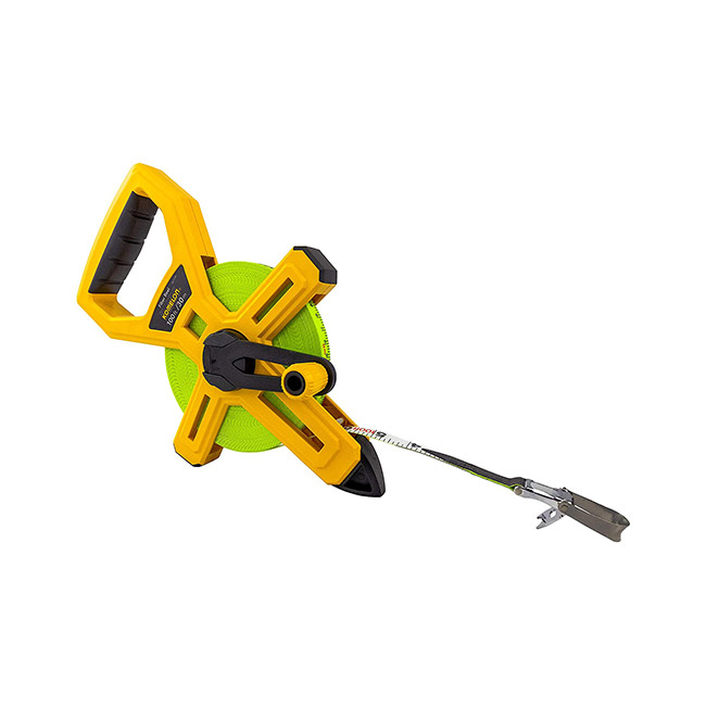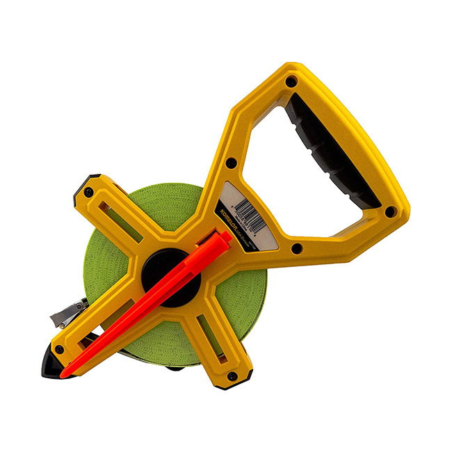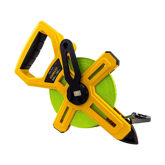 Komelon Open reel fiberglass tapes are perfect for all of your long measuring needs. The double coated fiberglass blade is waterproof and dirt resistant. The coating also protects the markings and graduations from chemical and mechanical abrasion. In addition to a heavy duty ABS frame, This tape has a two color blade with double sided printing and a versatile ring end hook and claw. With its dual scale blade allowing measuring in both inch and metric, The 6611IM is great on any jobsite or athletic field.