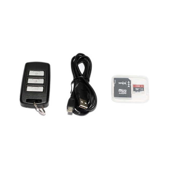 This covert device is equipped with a built-in rechargeable battery that offers up to 75 minutes of battery life with Wi-Fi turned off and up to 65 minutes with Wi-Fi on. A 16GB microSD card is included for storing captured footage. Also included are a USB cable and a microSD card adapter.