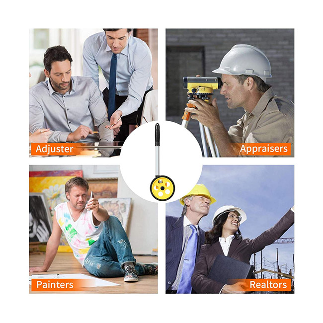Who Uses It】 The surveying wheel is great for indoor, outdoor projects, also ideal for real estate appraisers, law enforcement, construction workers landscaping workers and homeowners to measure your boundary lines of your property. Versatile enough to use on a variety of indoor and outdoor projects, this tool is ideal for real estate appraisers, law enforcement, construction or landscaping workers and homeowners alike.