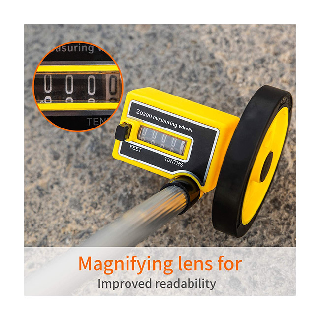 Imperial Measuring】 The Zozen Measuring Wheel Measured in feet and tenths of feet. Feet with decimal points can be better used for mathematical calculations. up to a 9,999.9 foot range. Using three-stage telescopic to achieve the most portable. and comes with a carrying bag.