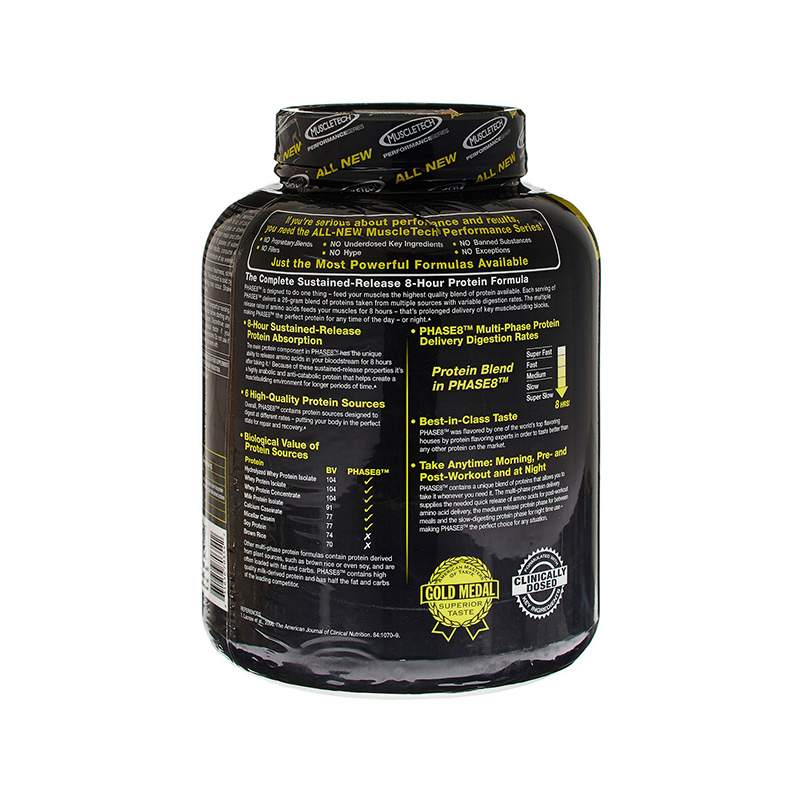PHASE8™ is a premium blended fast, medium and sustained-release protein formula that feeds your muscles for 8 hours. Each scoop contains an impressive 26-gram blend of milk-derived proteins that supplies a sustained-release of amino acids. PHASE8™ has a superior, clean macronutrient profile with only half the carbs and fat of the leading competitor. The main protein component in PHASE8™ has the unique ability to release amino acids in your bloodstream for 8 hours after taking it.1 Because of these sustained-release properties, it’s a highly anabolic and anti-catabolic protein that helps create a muscle-building environment for longer periods of time. Overall, PHASE8™ contains only high-quality milk-derived protein sources designed to digest at different rates, putting your body in the perfect state for repair and recovery. Unlike other protein blends, you won’t find any low quality proteins like rice protein in PHASE8™. PHASE8™ was flavored by one of the world’s top flavoring houses by protein flavoring experts in order to taste better than any other protein on the market. PHASE8™ contains high quality milk-derived protein and has half the fat and carbs of the leading competitor. NO proprietary blends / NO under dosed key ingredients, NO fillers – period! MuscleTech™ Performance Series supplements gives it to you straight with fully disclosed doses (no proprietary blends), no fillers, no hype and no exceptions. Our products are built on legitimate science so that you get what you pay for. Make the smart choice. We challenge you to compare!