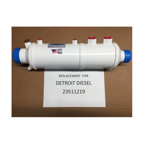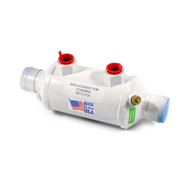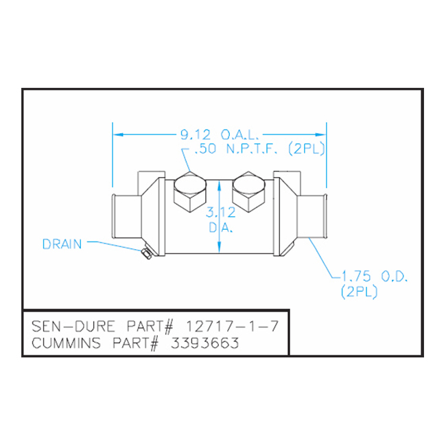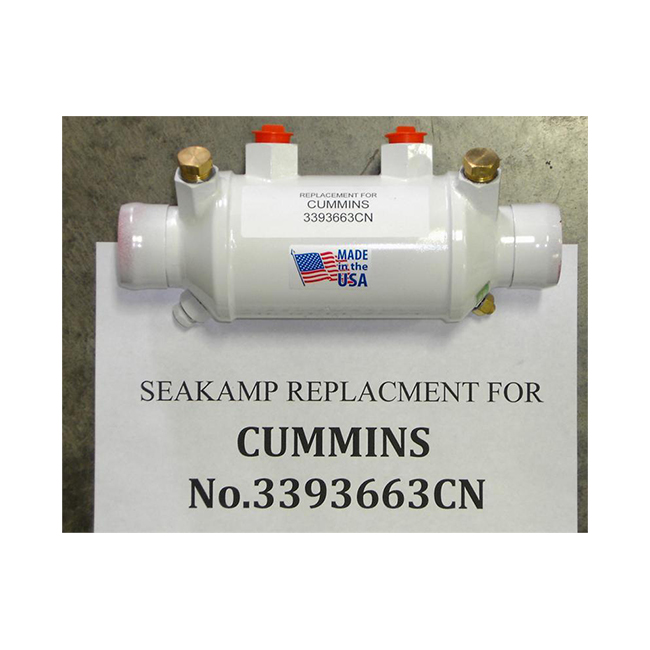Cummins 3393663 Transmission Oil Cooler replacement by Seakamp Engineering. Exact replacement oil cooler for Cummins Part # 3393663 and Sen-Dure Part # 12717-1-7 used on Cummins 6BTA marine diesel engines, horsepower models 300, 315, 330, and 370. Made of copper and bronze with internal tubes and tube sheets made with 90/10 Cupro Nickel. Comes with zinc anode and ground lug. Works with original ZF, Hurth, Twin Disc, Velvet Drive, or Borg Warner transmission.