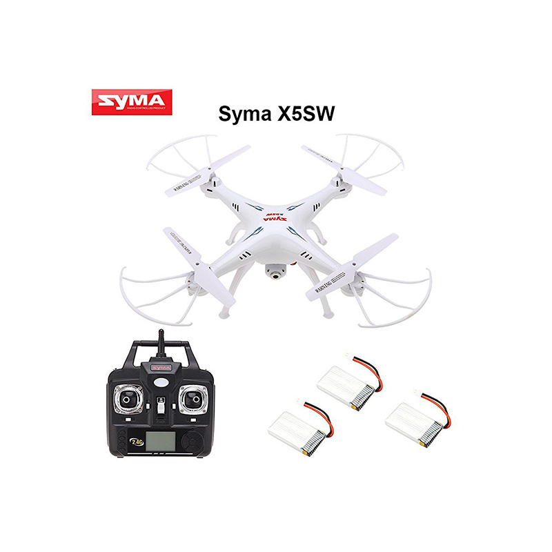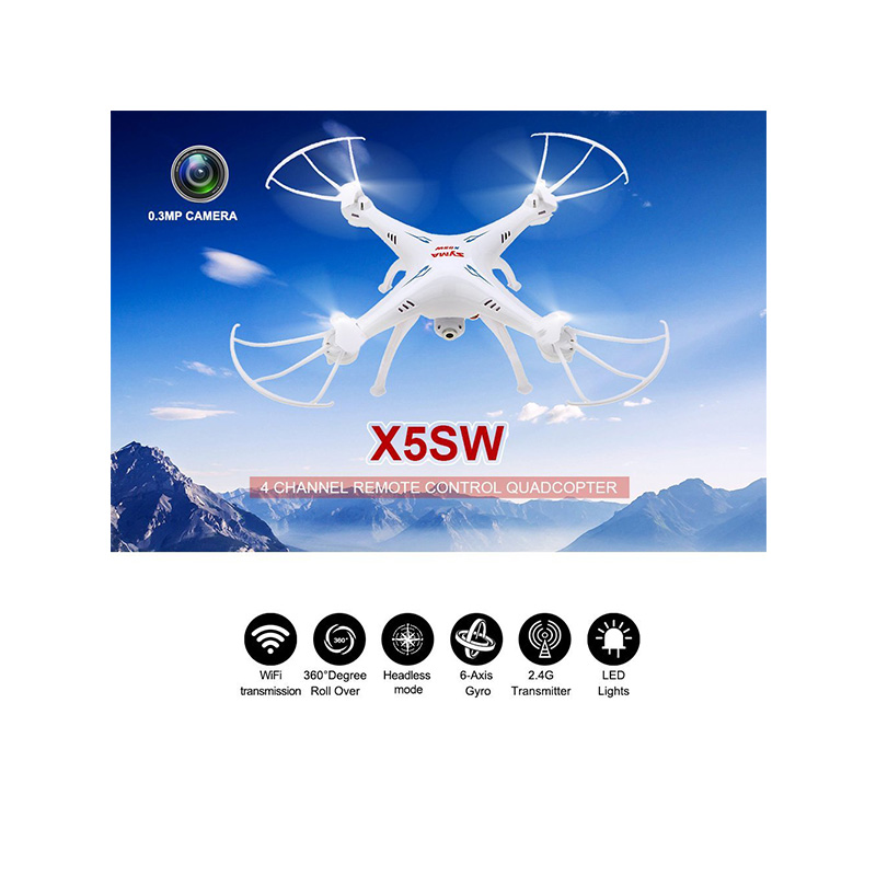 Specifications: 1. Brand: Syma 2. Model: X5SW 3. Channel: 4CH 4. Frequency: 2.4Ghz 5. Gyro: 6-Axis 6. Suit Version Type: RTF 7. 8. Functions: 360-Degree 3D Rolling 9. Flight Time: 5-6 Minutes 10. Recommended Environment: Indoor / Outdoor 11. Battery Type: 3.7V 500mAh Lipo Battery 12. Remote Control Distance: 50 meters 13. Charging Mode: USB Charging 14. Charging Time: 120 Minutes 15. Material: Plastic 16. Color: White Features: 1. 6-axis gyro based on 4 channels ensures a stable and fast flight 2. Capable of 360-degree 3D rolling, and other technical actions 3. camera allows for a clear first person view from the sky 4. Support cellphone control from Android smartphone and iPhone via Wi-Fi connectivity 5. Headless mode avoids the difficulty of identifying the head and tail when you start to fly 6. 500mAh battery, super long fly time 7. Up to 50-meter long RC distance 8. Left hand control, ideal for pilots of all skill levels 9. USB charging for more convenience FAQ: How to download APP: You can scan the two-dimensional code on the box Package included: 1 x SYMA X5SW Quadcopter (Black color) 1 x Transmitter 2 x 3.7V 500mAh Li-poly Battery 4 x Blades 1 x USB Charger 1 x Support frame 1 x Screwdriver 1 x Keychain