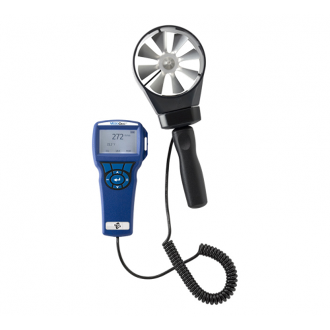 The 5725 VelociCalc accurately measures air velocity and temperature, calculates flow rate, performs averaging, and can determine minimum and maximum readings. Using sweep mode you can quickly provide one averaged reading of velocity or volume over a large measurement area. The large vane head automatically averages velocity and volume readings.